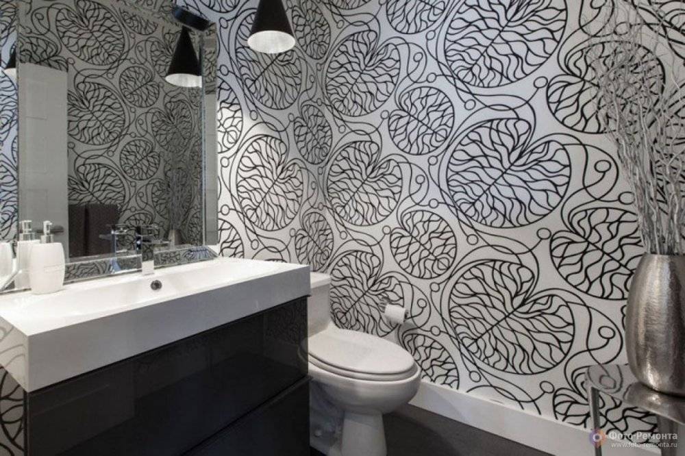 А вот еще один пример нетривиального дизайна ванной комнаты. Виниловые обои, небольшой шкафчик под раковиной и зеркало. Такой интерьер очень стильный.
