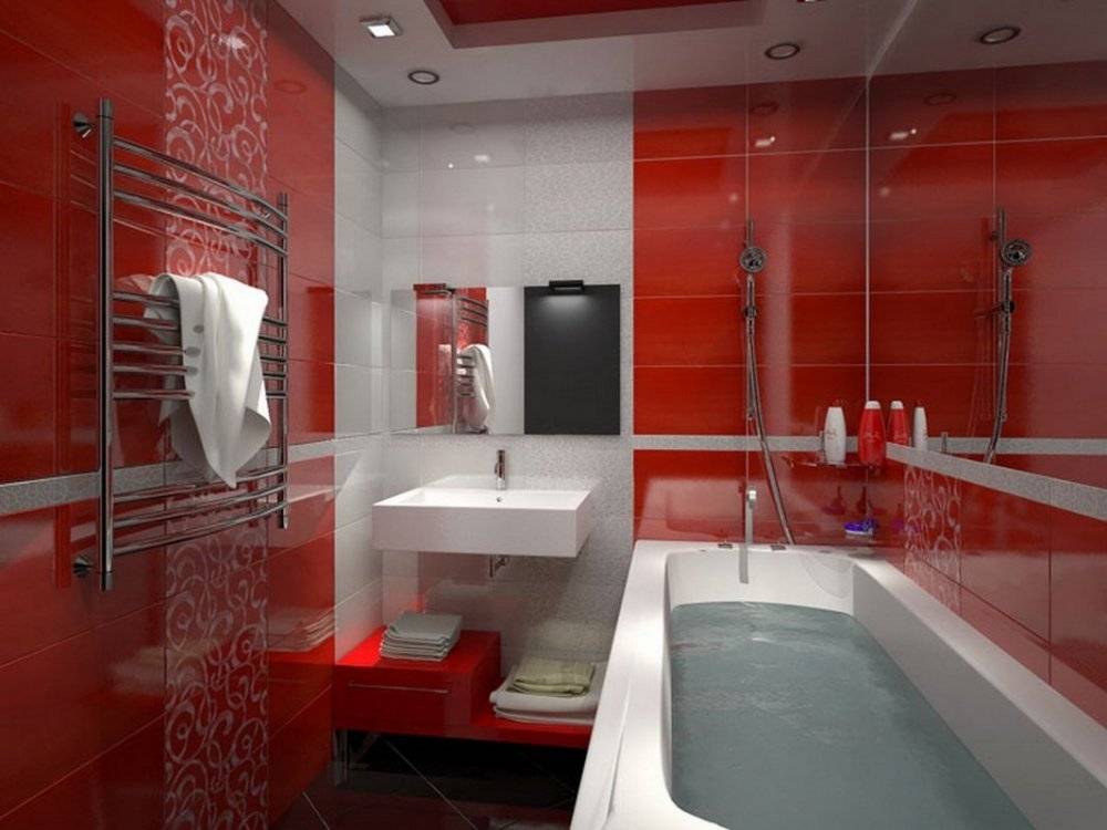 Например, для ванной в японском стиле. Эпатажно смотрится вариант дизайна в красных тонах, но он требует большого пространства.
