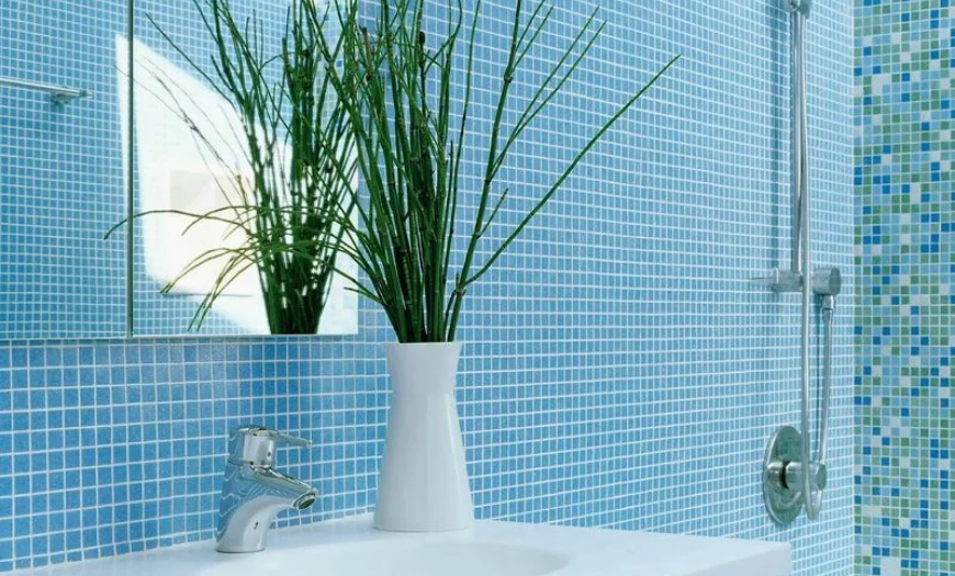 - В приоритете мелкая плитка. Чем меньше площадь ванной, тем миниатюрнее должна быть плитка. Идеальным вариантом будет оформление стен при помощи плитки-мозаики, особенно стеклянной мозаики.