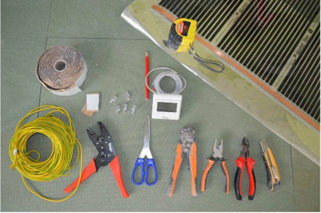 Для самостоятельного выполнения работ по обустройству системы «тёплый пол» на основе инфракрасной пленки под плитку, необходимо подготовить стандартный набор материалов и основной рабочий инструмент, представленный: