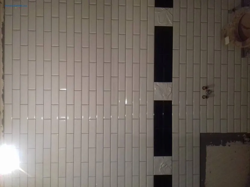 Иногда подобным способом облицовывают стену возле ванной, бетонные перегородки в душе. Отделку лучше выполнять узкой прямоугольной плиткой.