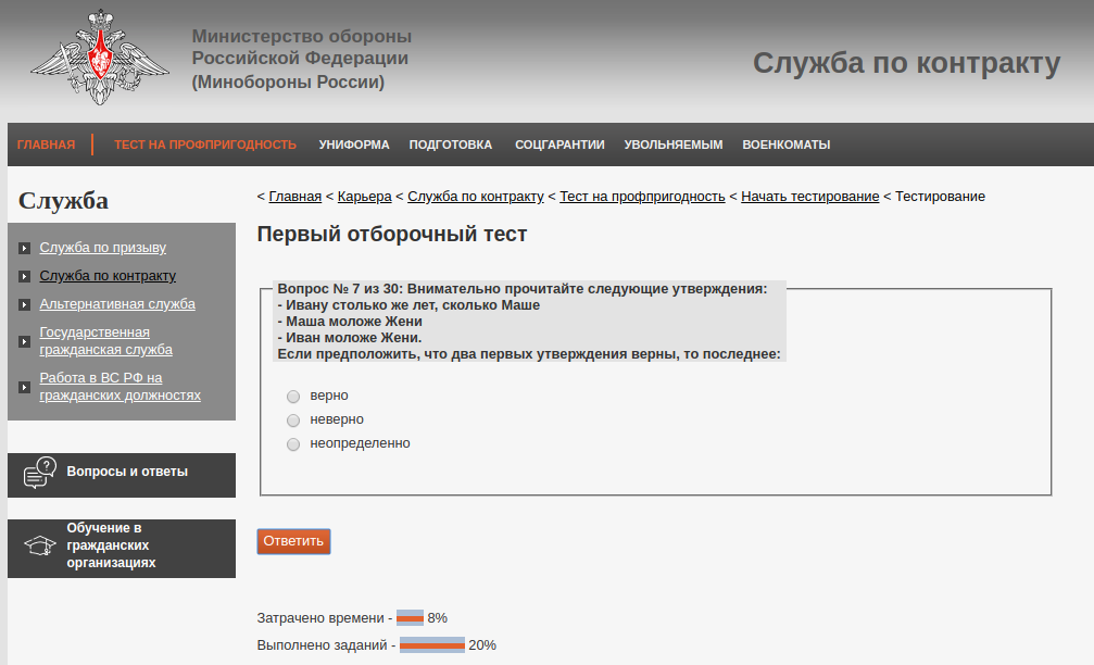 Пример вопроса из теста умственных способностей на сайте минобороны РФ