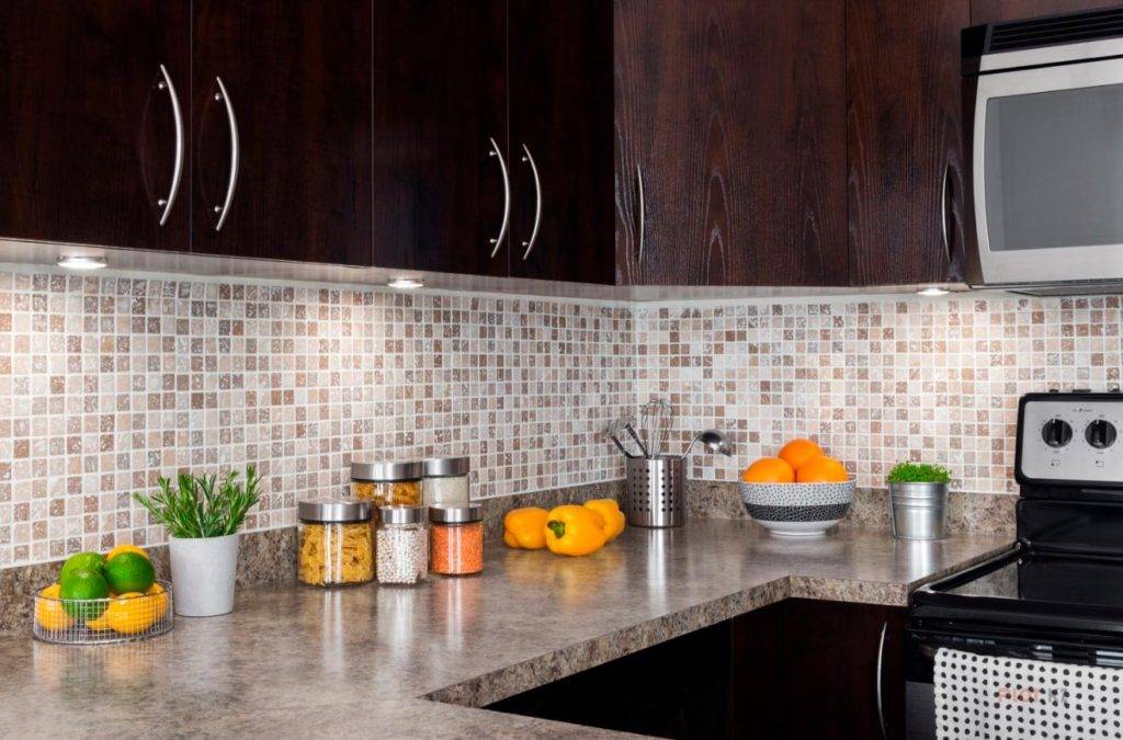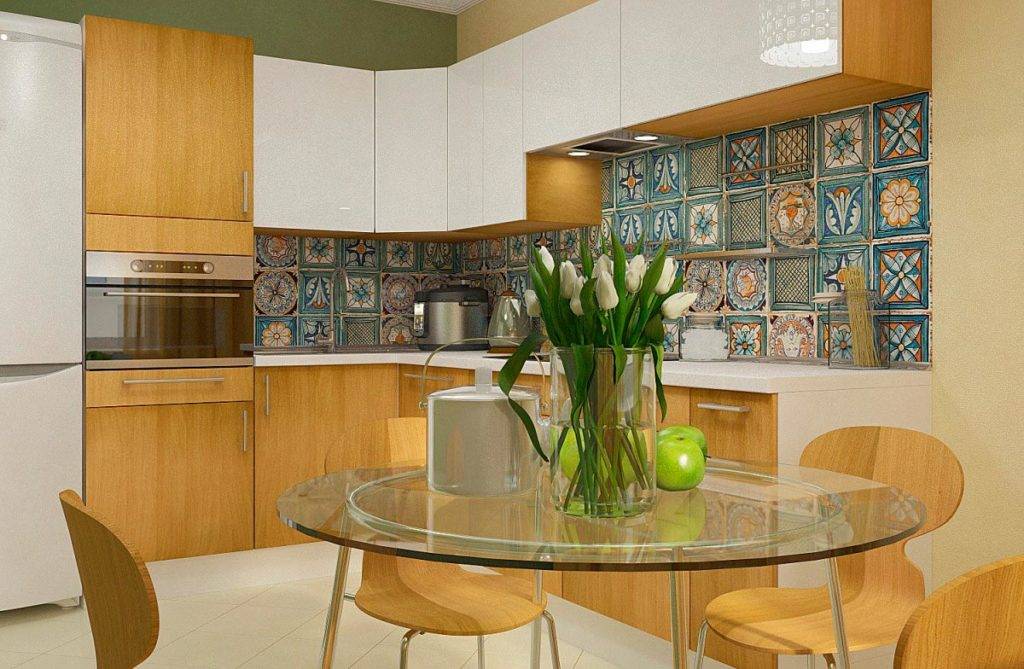 Если кухня имеет небольшую площадь, фартук лучше выкладывать из маленьких плиток. Подойдет мозаика, бордюр или стандартная плитка 10х10. Не стоит выбирать фартук с крупным рисунком. Он визуально уменьшит размер кухни.