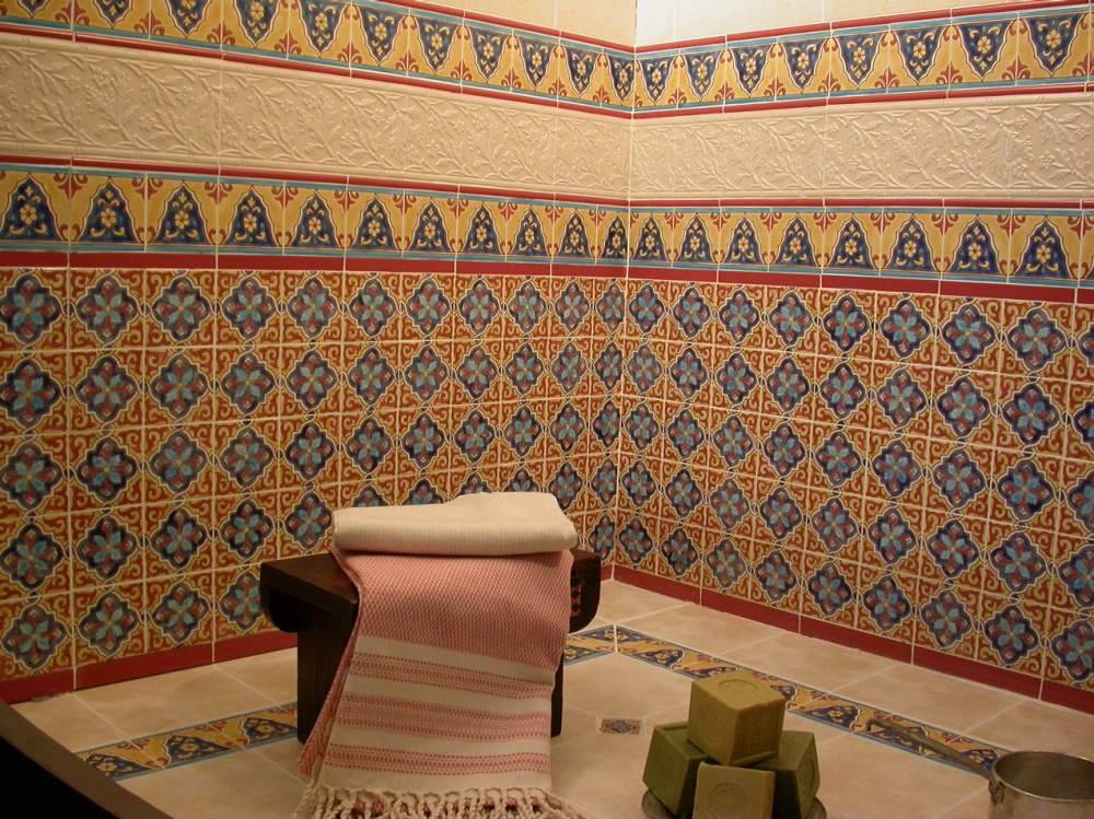 Восток. Знаменитые турецкие «огурцы» на сей раз располагаются на плиточках. Интерьер в этом стиле всегда пестрый, незаурядный, иногда даже аляповатый