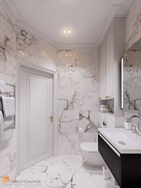 Если у Вас все в порядке с деньгами, можете выполнить отделку плиткой под блестящий мрамор. Подобная схема не зря считается классической — ведь ее любят практически все люди (даже те, кто любит все только новое).