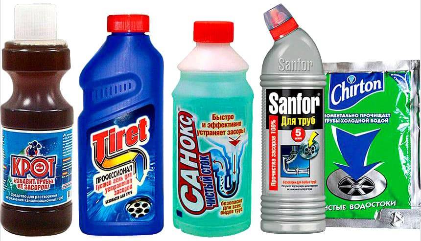 Средство необходимо выбирать в соответствии с материалами, из которых изготовлены трубы канализационной системы и предполагаемого типа засора. Наиболее известное универсальное средство «Крот». Благодаря кислотным соединениям в составе устраняет в трубах практически любые препятствия для нормального прохождения воды. Для застарелых и сложных засоров рекомендуется использовать быстродействующее гранулированное средство Baggi «Потхан».