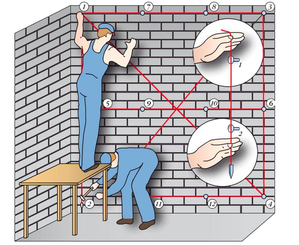 Не стоит спешить с отделкой. Сначала определяют, насколько поверхность готова к работе. Для этого каждую стену провешивают, отступая от угла примерно 20-25 см. Затем с двух сторон сверху и снизу вкручивают саморезы. После этого между ними натягивают нити в вертикальном, горизонтальном и диагональном направлениях.
