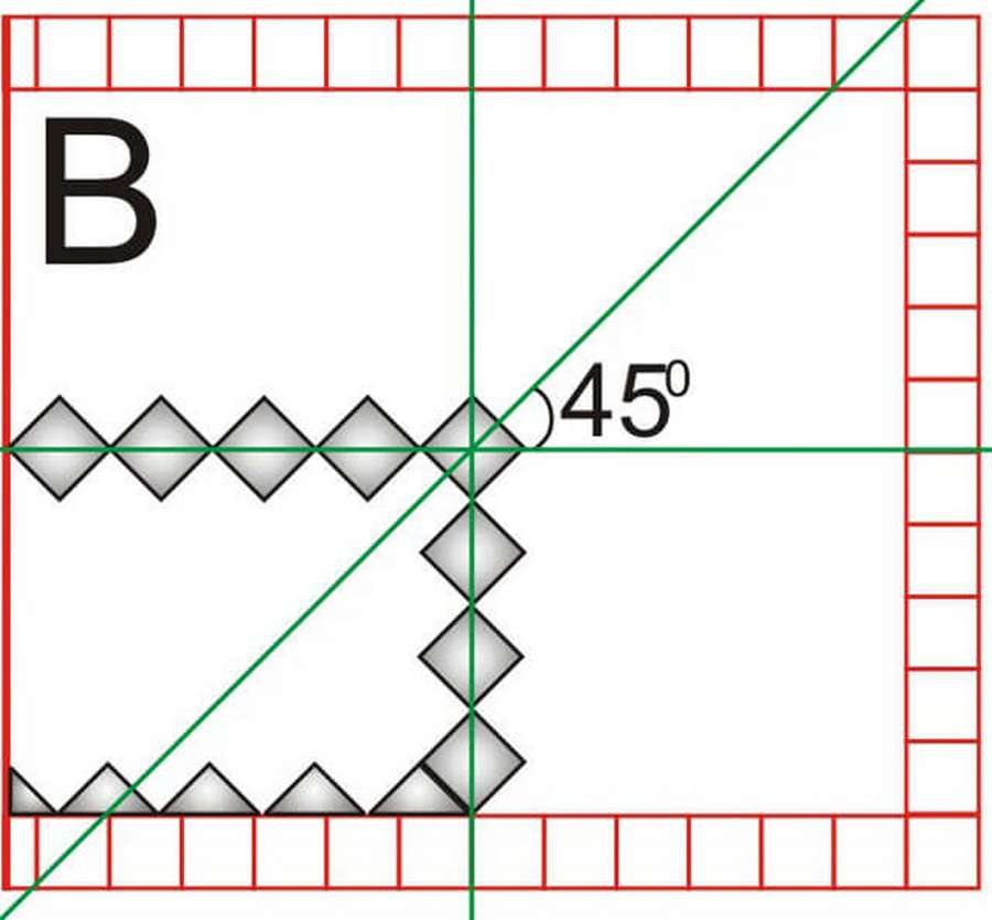 Прямоугольник отбивается с помощью шнуров и рулетки. Противоположные стороны, как и диагонали, должны быть равны. Пройдясь по наружному контуру прямоугольника плиткой «шов в шов», можно начинать класть керамику с самого просматриваемого места. Внутренний контур состоит из чередующихся половинок и целых плит. В отличие от обычного способа, шнуры натягивать следует по двум диагоналям, образуя прямой угол.