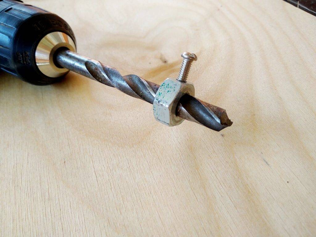 - Изготавливают специальную приблуду из болта М6 любой длины, гайки и шайбы. В последней высверливают отверстия по количеству проводов, используемых для скрутки. С помощью гайки фиксируют шайбу на болт. Подготовленное устройство зажимают в шуруповерте. В отверстия на шайбе вставляют зачищенные провода, включают инструмент.