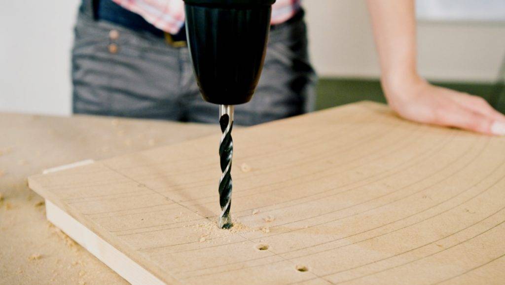 Аккумуляторный шуруповерт для шлифовки поверхностей выбирают по причине его компактности и удобства эксплуатации в труднодоступных местах. При помощи насадки «коронка» изготавливают 2 круглых заготовки из фанеры, на одну из которых наносят карандашом разметку. Затем в полученных деталях высверливается отверстие, равное диаметру шпильки – 8 мм.
