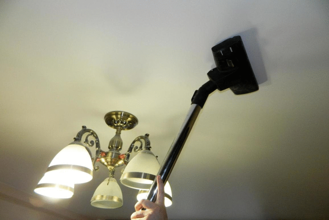 Лучше всего обрабатывать такую поверхность пылесосом на расстоянии. Что бы убрать пыли с полотна достаточно пройтись по потолкам шлангом с насадкой на расстоянии 5-10 см. Увеличьте мощность пылесоса и тогда вся пыль, скопившаяся в верхней части помещения будет собрана.