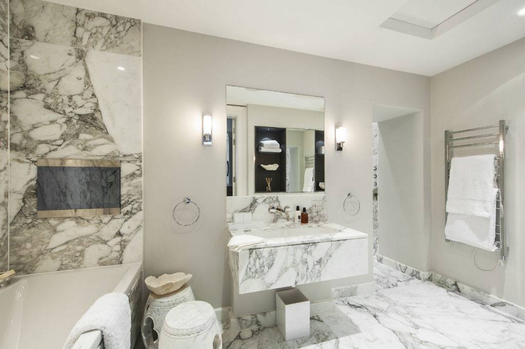 Имитация мраморного керамогранита, используемого для отделки стен ванной комнаты, практически не требует ухода — они не нуждаются в пропитке, не царапаются, не пачкаются, просто протираются тканью. Еще один хит материала — большие керамические пластины размером 100 х 300 см (керамогранит, спеченный кварц).