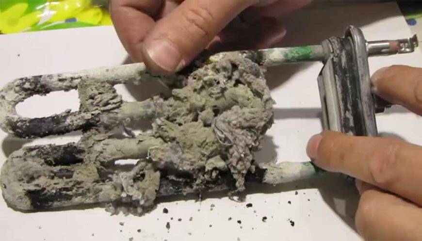 - Вытащив нагреватель, необходимо его почистить. Но ни в коем случае не делайте это с помощью наждачной бумаги, ножа и других предметов.
