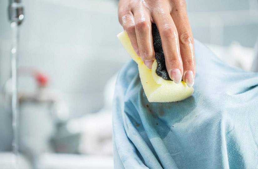 - Если пятно свежее, с помощью мочалки и холодной воды тщательно протрите место загрязнения.
