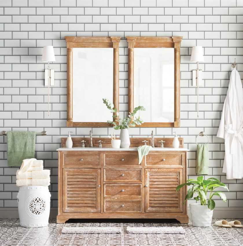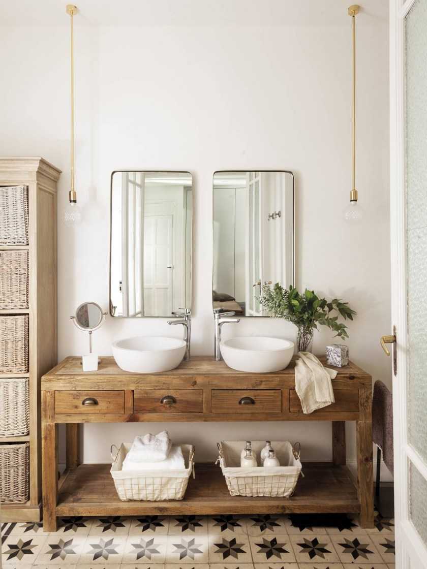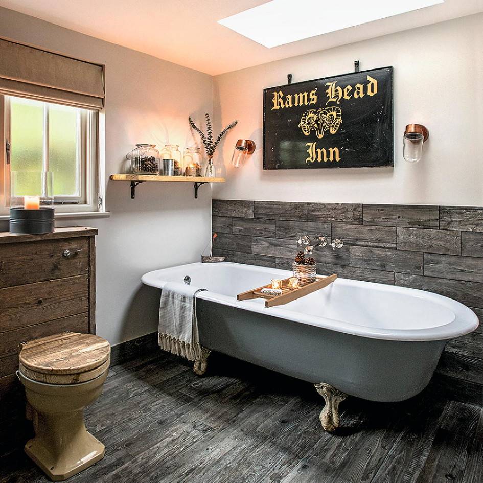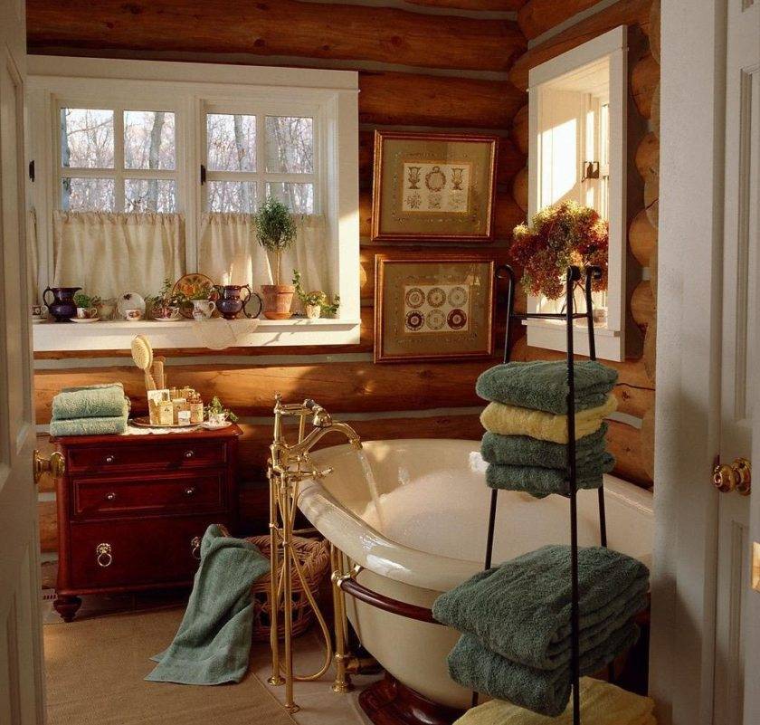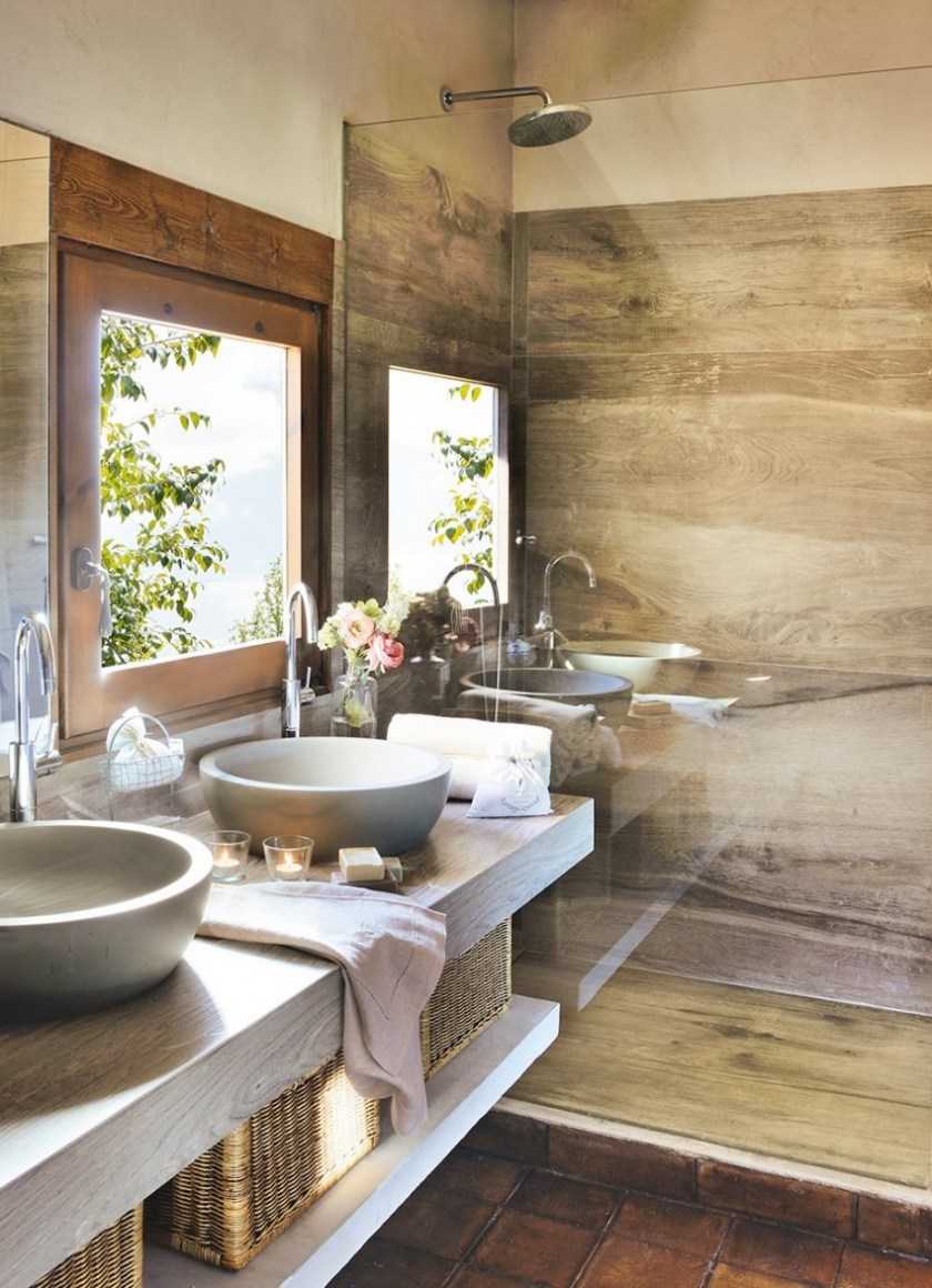 Для санузлов в частном доме подойдет деревенский стиль. Для него характерно использование деревянных материалов не только для отделки пола, но и для мебели.
