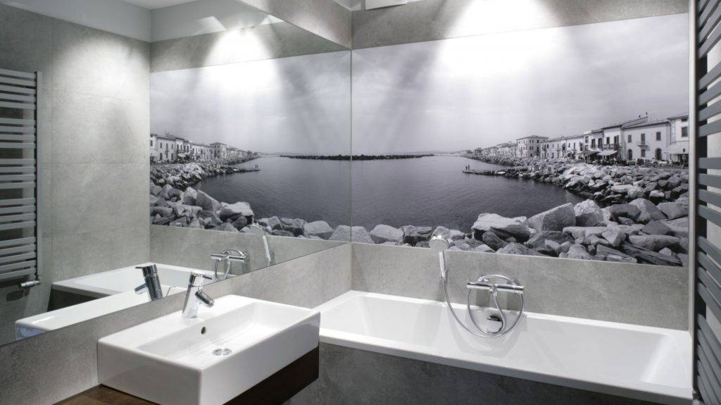 Модной альтернативой керамике при отделке стен в ванной комнате является стекло, которое очень хорошо используется при отделке стен. Оно обычно изготавливается из стеклянной мозаики, то есть маленьких стеклянных элементов, наклеенных на сетку, и лакобеля, то есть лакированных стеклянных панелей, выполненных по размеру, а также зеркал, которые не должны быть обрамлены.