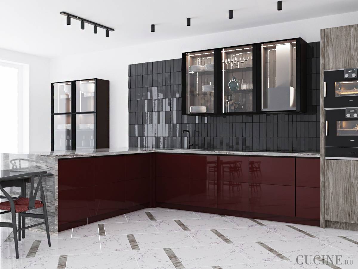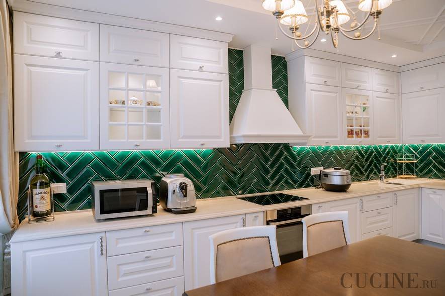 Например, модный изумрудный, винно-красный, бирюзовый, ярко-желтый, розовый цвета. Акцентная плитка подсвечивается светодиодной лентой внизу верхних шкафов и выглядит еще красивее!