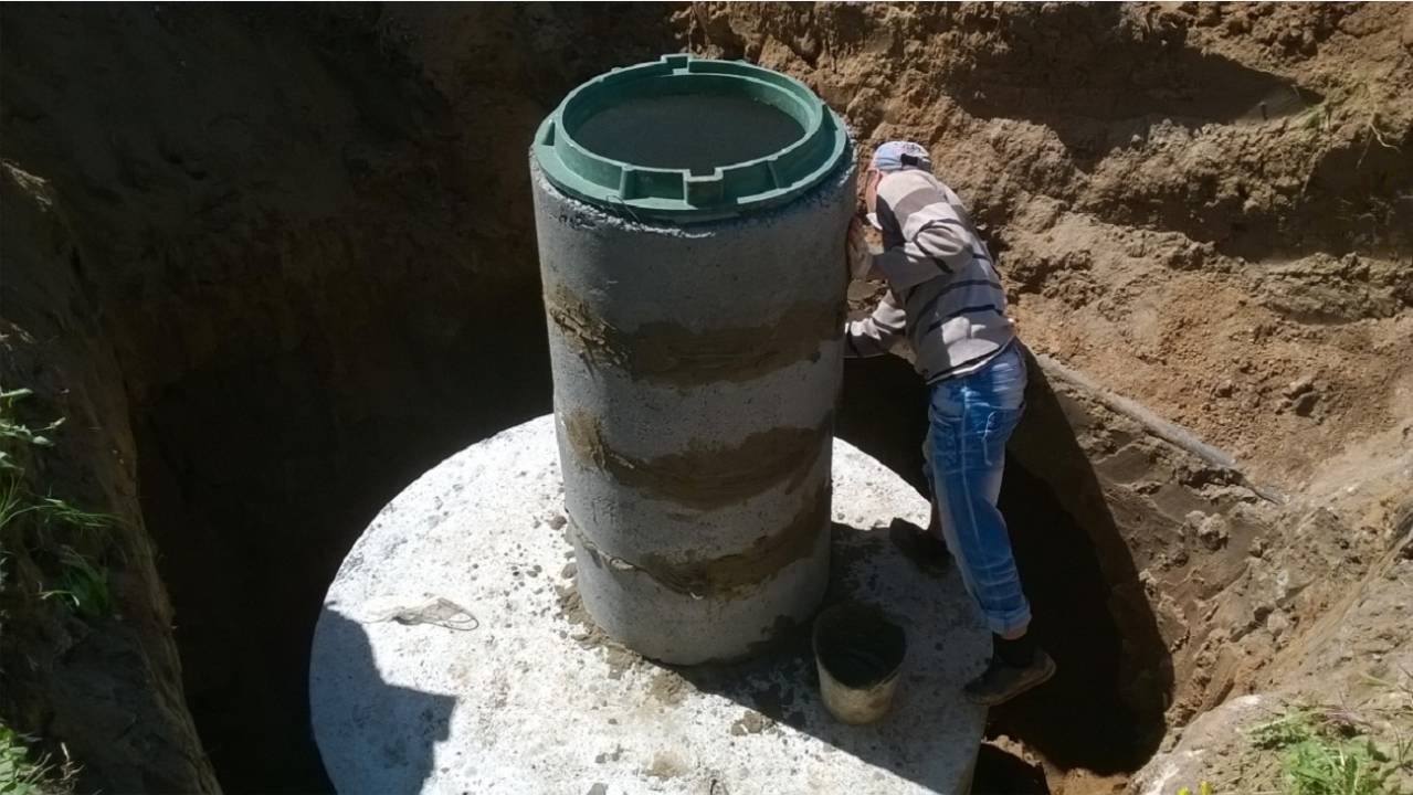Стыковочные швы и все имеющиеся повреждения обязательно тщательно заделывают с внешней и внутренней сторон. Это делается при помощи специальной затирочной смеси. Для окончательной защиты от влаги обработанную поверхность нужно покрыть гидроизоляционным составом. Его наносят с наружной стороны после высыхания затирки. Скобы из металла, скрепляющие кольца, помогут предотвратить их смещение в процессе эксплуатации. Важный момент при их установке — уровень промерзания грунта в период самых низких температур в регионе.