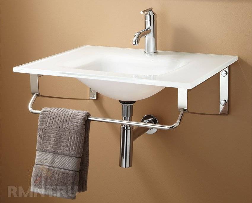 При отсутствии ножки крепление раковины будет испытывать динамические нагрузки, поэтому двумя шпильками здесь не обойтись. Устанавливают кувшинку на специальные кронштейны. Это могут быть как простейшие уголки из стали, так и вычурные скобы с хромированным покрытием. Есть разновидность раковин с двумя круглыми каналами внутри бортов, которыми чаша надевается на две трубы, жёстко закреплённые к стене.