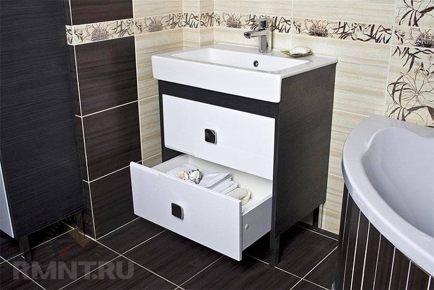 Большое значение имеет и обустройство ванной комнаты. Например, если в комнате имеется теплый пол, не стоит приобретать мебель с цоколем, лучше купить тумбу под раковину с ножками