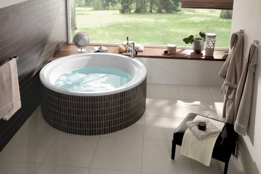 Диаметр круглой конструкции колеблется в пределах от 140 до 210 см. Независимо от того, какого диаметра круглая модель, для её монтажа требуется достаточно много места. Таким образом, она не подходит для установки в помещении с ограниченной площадью. Наиболее правильный вариант размещения круглой ванны – организация подхода со всех сторон.