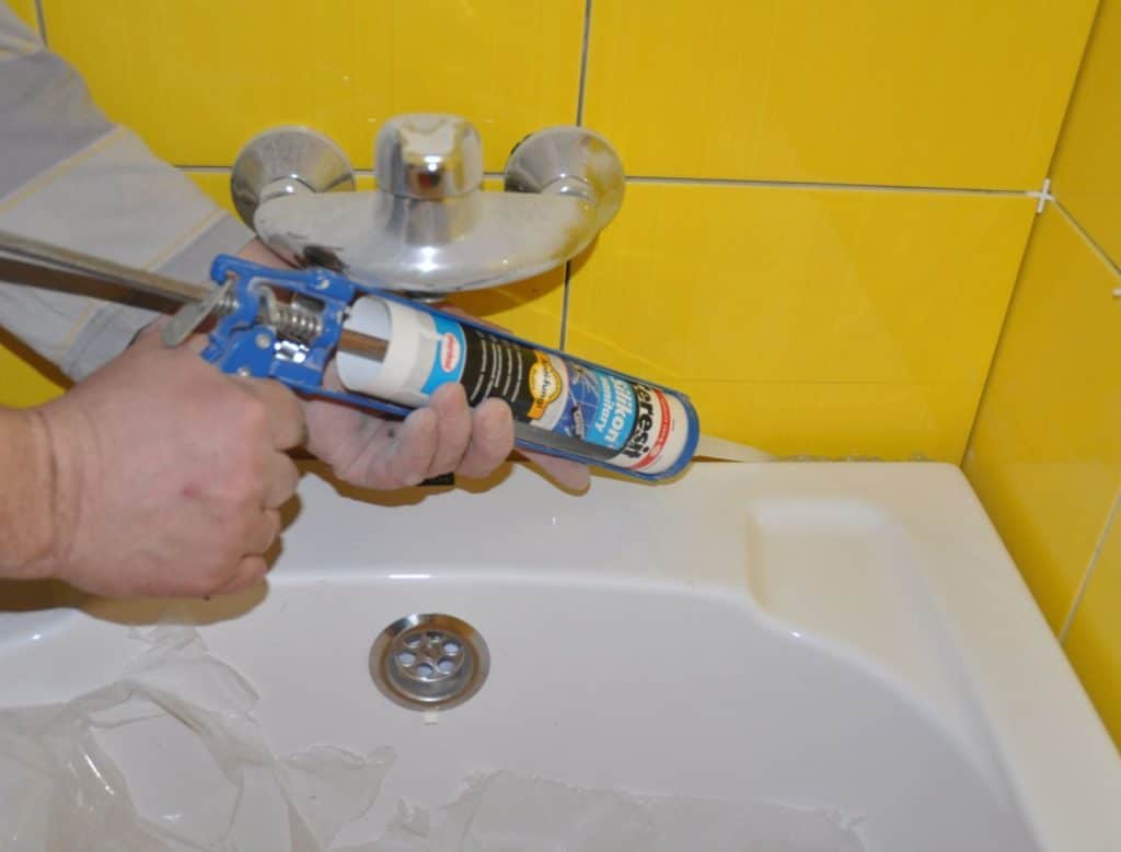 - В зазор между стеной и бортиком закладывается силиконовый уплотнитель и дается время на его застывание.