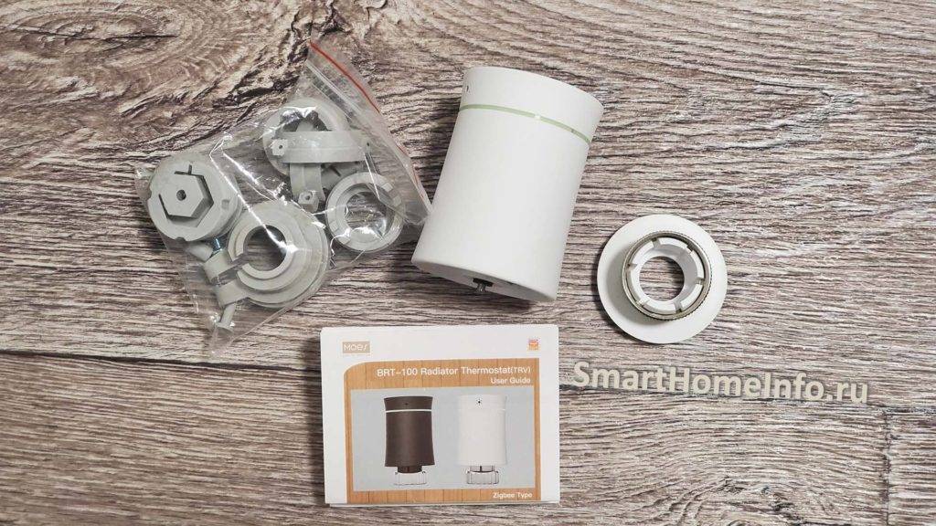 В комплекте поставки присутствует инструкция по эксплуатации, адаптеры для крепления к батарее и сам умный привод для радиатора. Он работает по протоколу Zigbee 3.0, для добавления в приложение подойдет любой шлюз из экосистемы Tuya Smart. С поддержкой соответствующего протокола конечно. Батареек в комплекте нет.