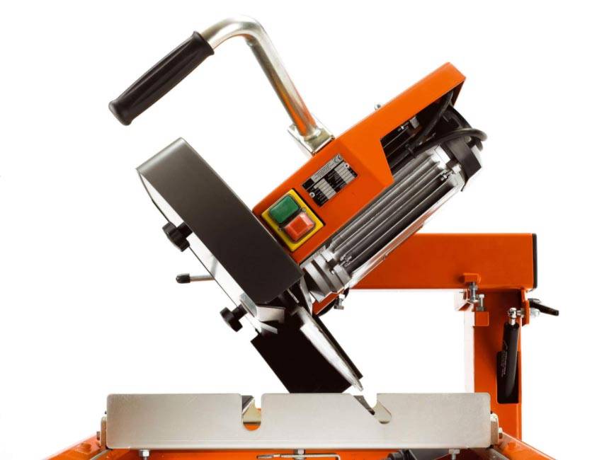 Запускается плиткорез, на металлический лист укладывается плитка и подводится отмеченным местом к диску. Медленным движением от себя производится режущий процесс. На плиткорезе, изготовленном на заводе, имеется резервуар с водой, который помогает остужать диск и делать ровный рез, при этом эксплуатировать станок можно на протяжении дня.