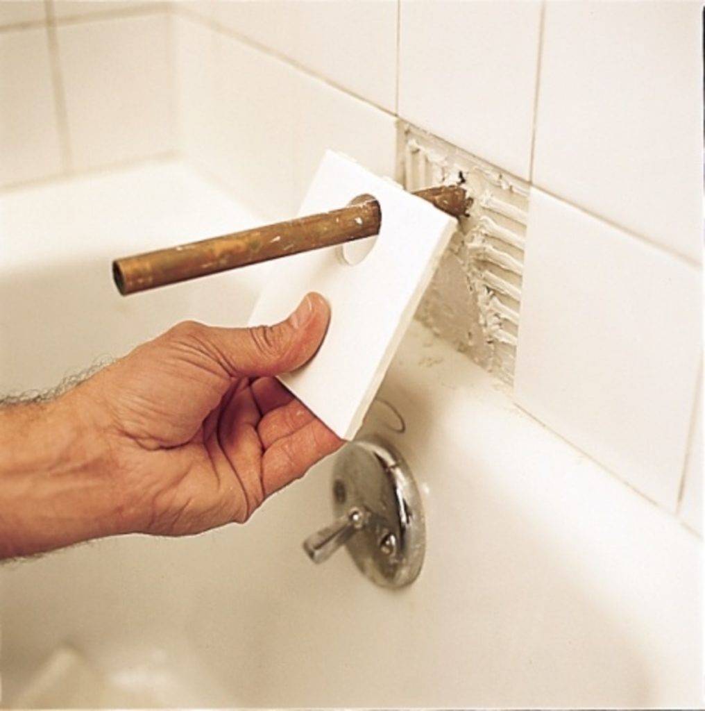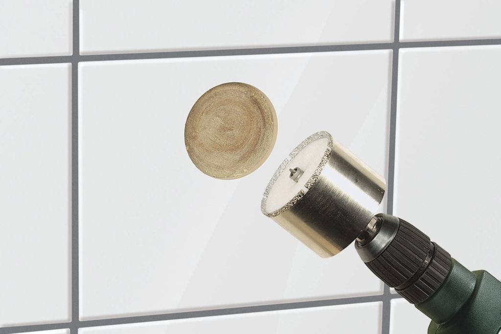 Для выполнения фигурного выреза плитки необходимо начертить круг нужного диаметра и отметить в нем центр. Затем следует закрепить насадку на дрели и поставить сверло в центр круга. Инструмент нужно держать строго перпендикулярно поверхности. Затем включают дрель и делают отверстие. Недостатком данного приспособления является шероховатость образованной кромки плитки. Дополнительно материал шлифуют, чтобы получить гладкие края.