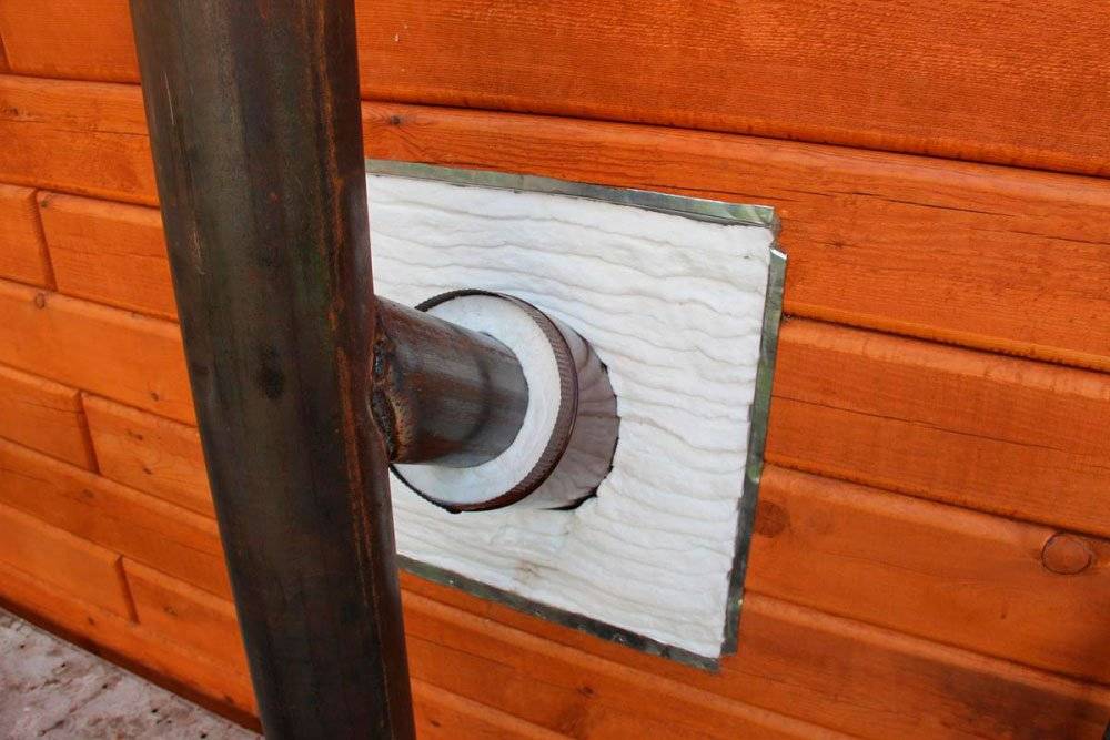 Места, где осуществляется проход трубы через потолок и прочие строительные конструкции следует рассматривать с учетом того, что изнутри они обшиты деревом, то есть, сгораемым материалом