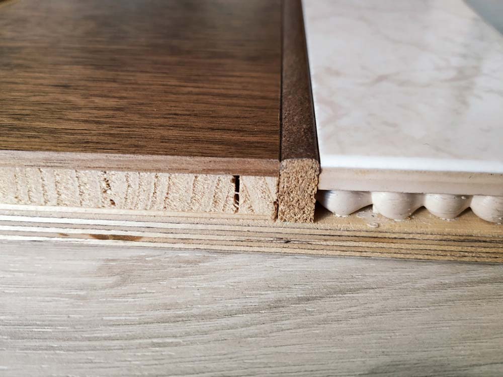 - HDF-ламинат на 70% состоит из древесины. Как следствие, после некоторого контакта с водой торцовые поверхности начинают разбухать и коробиться. На кромках в процессе эксплуатации формируются характерные сколы и потертости, ухудшающие внешний вид;