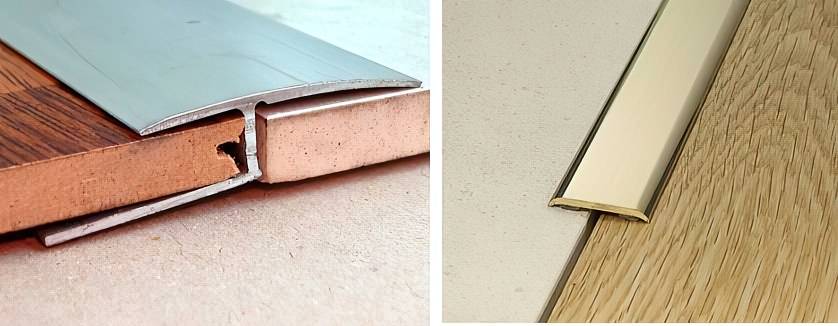 Использование ПВХ профиля для оформления шва между плиткой и ламинатом - Гибкий металлический профиль. Гнется за счет эластичности металла (сплав) и особого фигурного края. Используется как для прямых, так и для изогнутых участков. Может иметь Т-образную и Г-образную форму. В случае использования Г-образного профиля, в него заправляют ламинат. Плитку затем клеят вплотную к краю, заполняя расстояние плиточным клеем, впоследствии оформляя затиркой для швов. Есть гибкие металлические пороги некрашеные — алюминиевые, есть с декоративной окраской (порошковый состав).