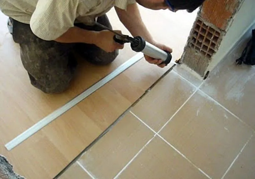Если щель на стыках широкая, устанавливать порожки, профили и молдинги не рекомендовано. Соединение двух компонентов происходит с помощью затирок, герметиков и компенсаторов. Такие вещества твердеют от контакта с воздухом. Они применяются исключительно после выведения поверхности на один уровень, качественной обработки и удаления дефектов (сколы, заусенцы, неровности).