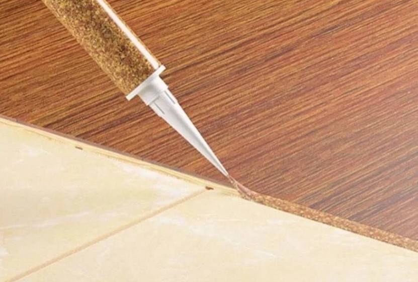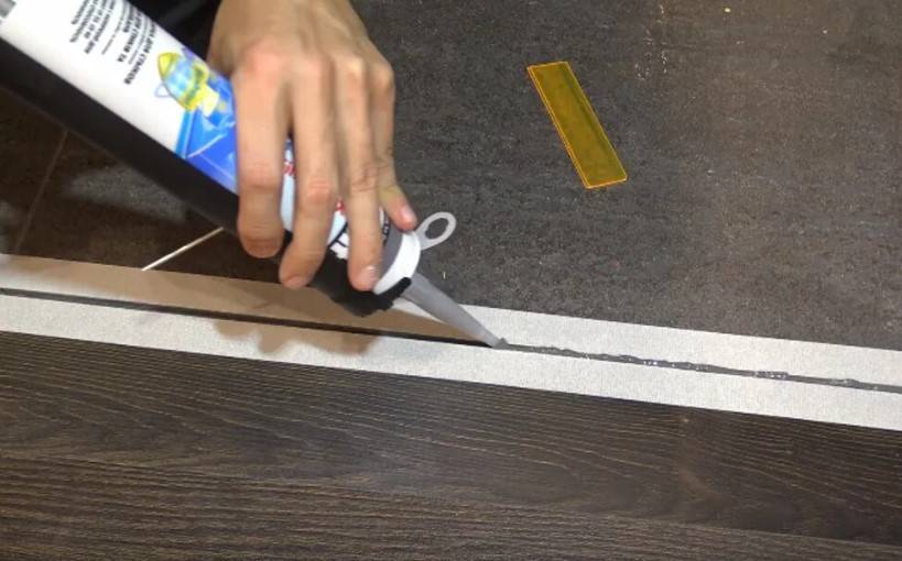 Цвет герметика подбирают под оттенок ламината, плитки или фуги. Герметик наносят на шов.