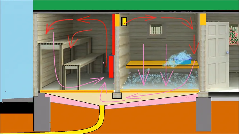 - Выход разогретого воздуха находится по диагонали от печи, располагается ниже лавки. Теплый воздух от печи поднимается вверх, создает под потолком повышенное давление, а в противоположном углу остывает и, опускаясь, попадает в вентиляцию.