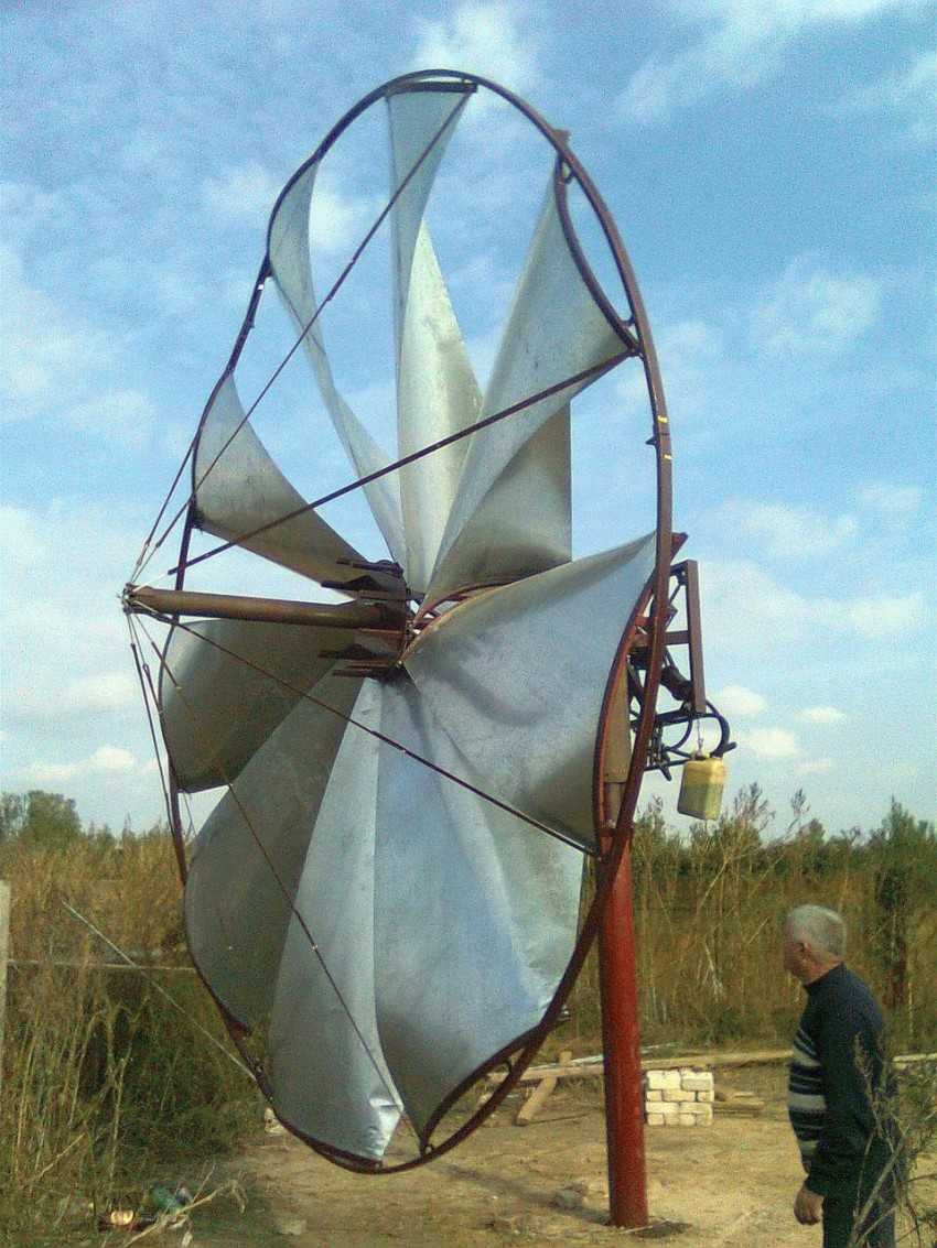 Лопасти этой установки роторного типа с вертикальной осью вращения явно выполнены из элементов, вырезанных из металлической бочки