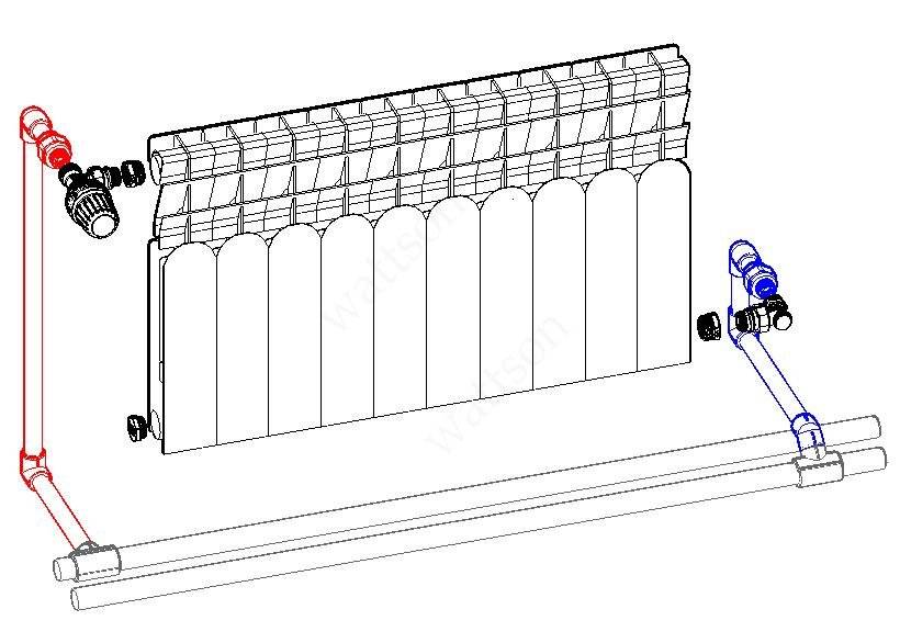 Наиболее эффективным для биметаллических батарей считается диагональное подключение, особенно если речь идет о большом количестве секций в приборе. Хотя очень широкие батареи, укомплектованные десятью и более секций нежелательно применять.