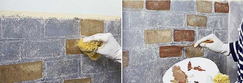 - Для придания «небрежности» используют губку. С ее помощью на поверхность наносят штрихи, мазки. Это «состаривает» кирпич.