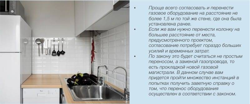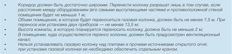 - Перенос колонки в обязательном порядке должен согласовываться с газовой службой, которая может вам и отказать. К примеру, в домах старого фонда и в квартирах с очень старыми колонками перенос вряд ли одобрят;