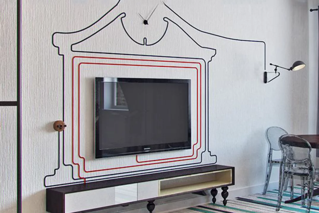 Альтернативный метод для художников – рисунок на стене. Под его цвет подбирается провод и прокладывается прямо по творчеству. Некоторые дизайнеры оснащают спрятанную проводку светодиодами. В таком варианте провода от телевизора превращаются в декор в любое время суток.