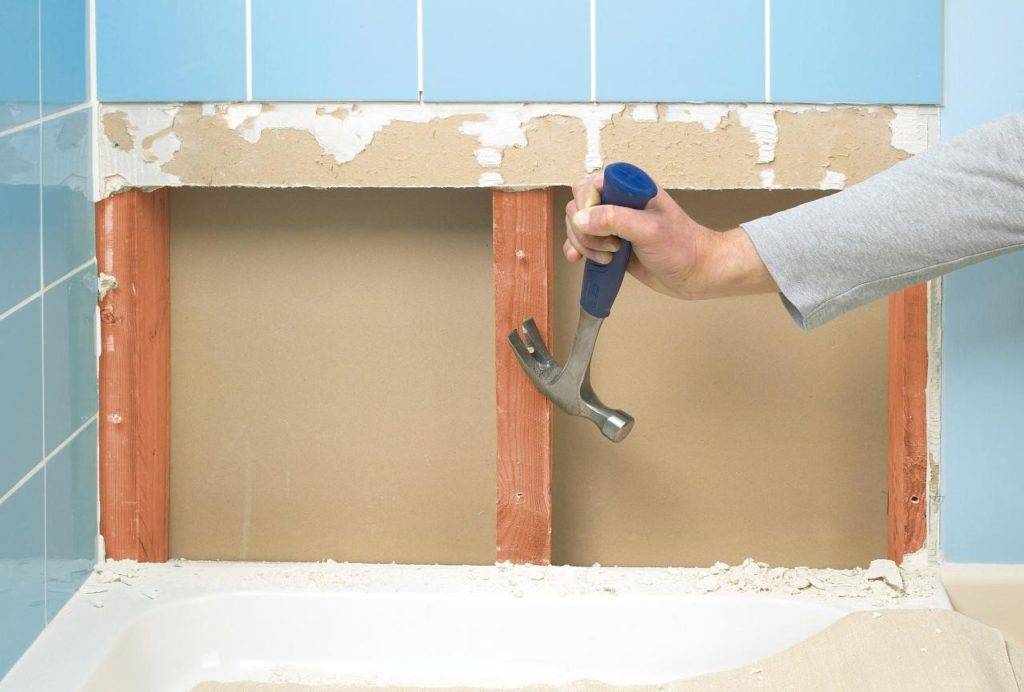 Стена из гипсокартона – идеальная поверхность для облицовки кафелем благодаря высокой способности к адгезии. Но вот с демонтажом возникают огромные трудности. Порой плитка на гипсокартонной стене держится настолько крепко, что ее приходится удалять вместе с перегородкой.