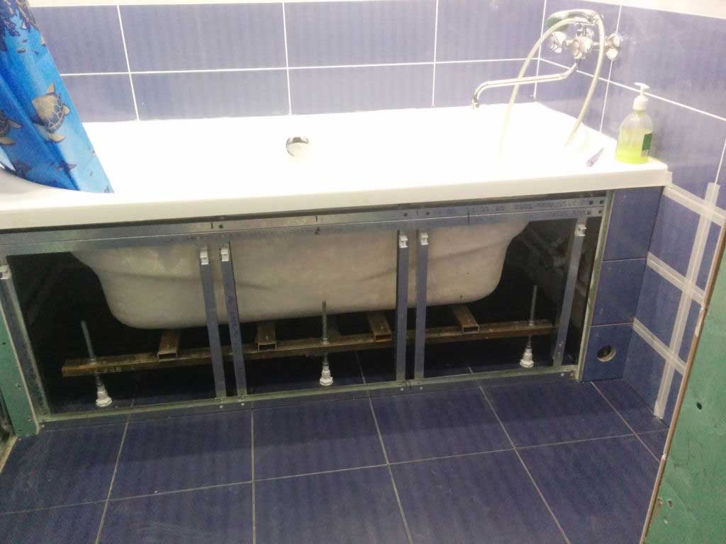 Перед началом монтажа большинства моделей необходимо собрать каркас вдоль периметра ванны. Его чаще всего изготавливают из алюминиевых профилей и гораздо реже из деревянных брусков. До того, как установить для ванны экран, сделанный из легкого пластика, каркас делать не нужно, поскольку его крепят непосредственно к бортику сантехники.