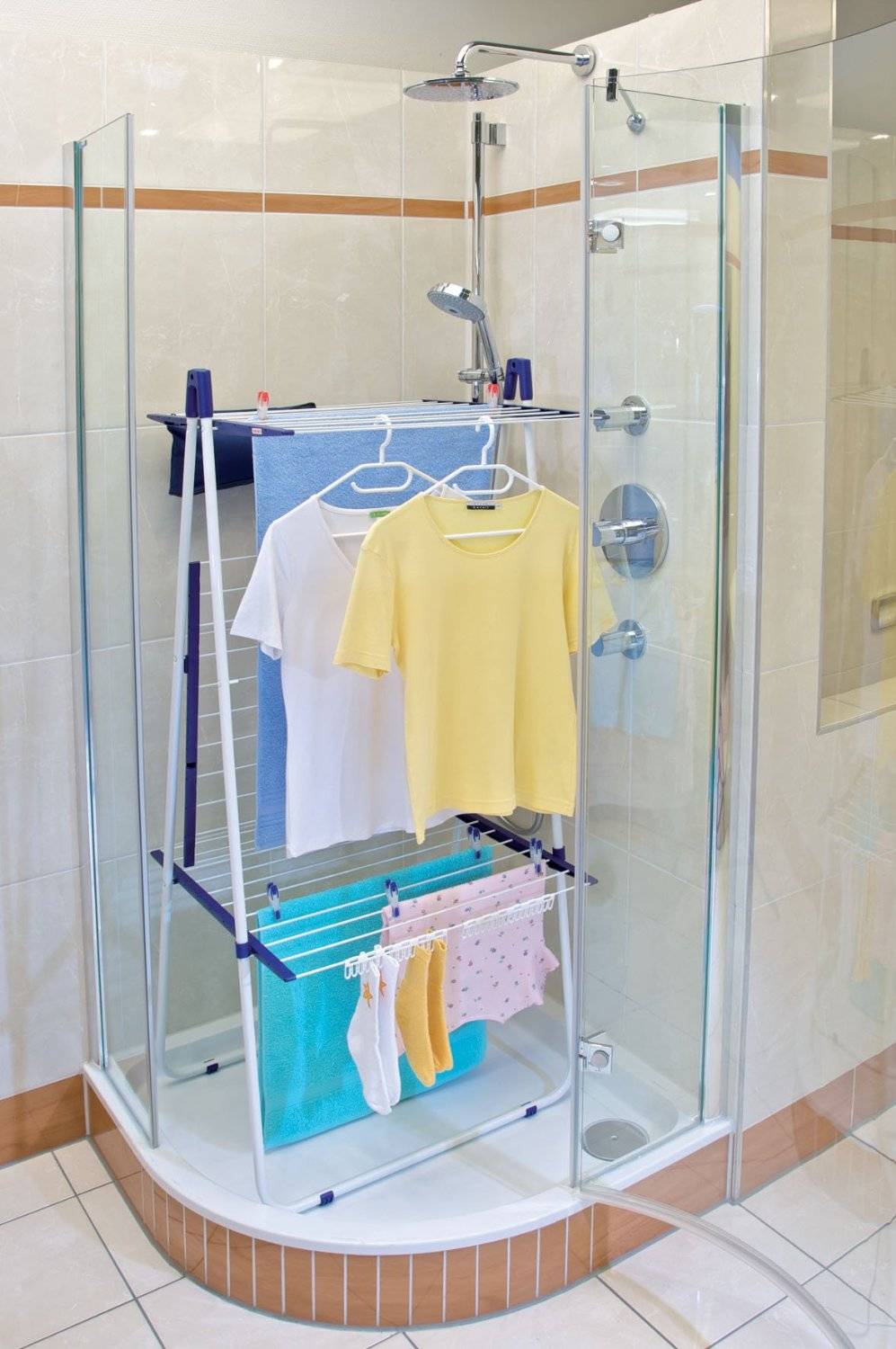 Конструкция с несколькими ярусами способна вместить в себя большое количество мокрой одежды, при этом она останется максимально компактной.