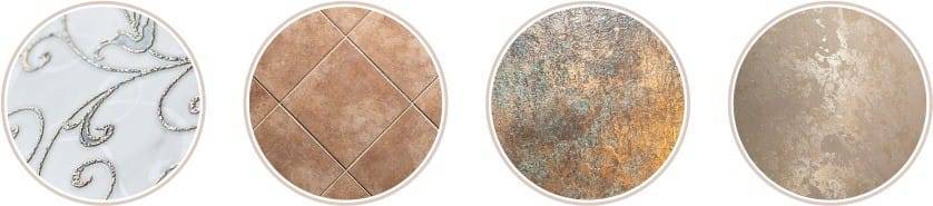 Структура поверхности керамики для пола может быть матовой с незначительным рельефом, имитирующим, например поверхность натурального камня или гладкой глянцевой. Шероховатая, пористая поверхность матовых изделий на полу приятна на ощупь и безопасна, так как обеспечивает противоскользящий эффект и безопасность. Глянцевые изделия чаще используют на стенах – глазурованное покрытие защищает изображение и делает их блестящими. С помощью глянцевой плитки можно визуально сделать помещение объемнее.