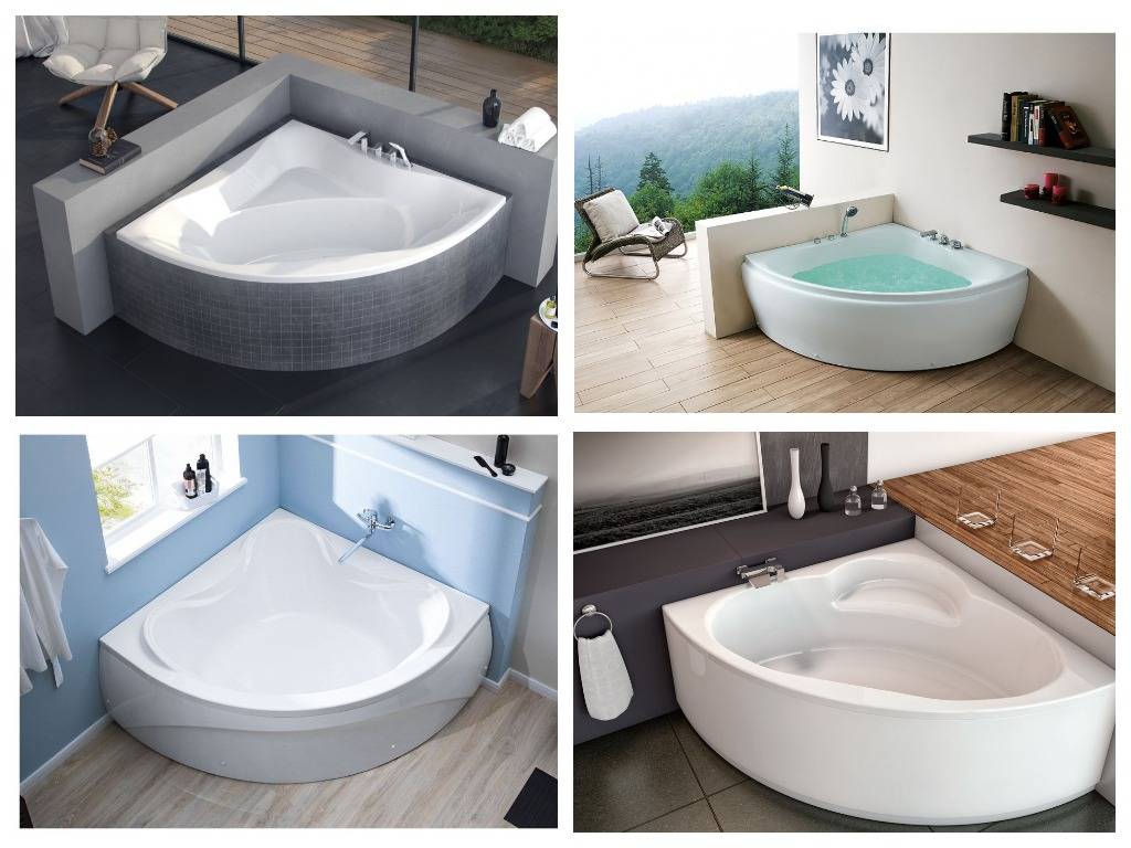 - Форма ванны не всегда соответствует равнобедренному треугольнику. Сегодня производители предлагают следующие варианты: