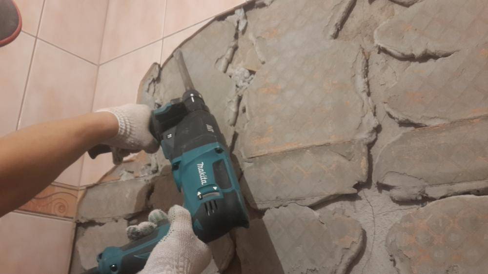 Старая плитка снимается путем поддевания ее стамеской и с использованием молотка при ручном способе. Для быстрого и тщательного удаления материалов машинным способом используют перфоратор, работы с которым проводят в защитных очках, избегая попадания осколков керамики в глаза.
