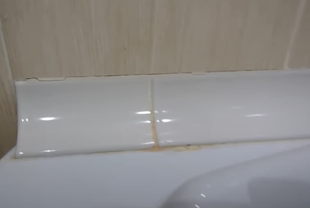 Керамический бордюр для ванны. Трещины на затирке появились из-за теплового расширения и сжатия ванны.
