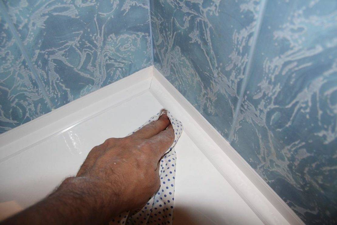 Базовым и бюджетным способом отделки стыка является установка уголков из пластика, позволяющая перекрывать щели до 30 мм. Ширину накладки подбирают в зависимости от зазора (после окончательного монтажа ванны и регулировки ножек). После замера расстояний делают заготовки, кромки подрезают под углом 45° (например, с помощью стусла) для получения аккуратного стыка. На уголок наносят клей либо герметик и плотно прижимают изделие к стене и борту ванны. Излишки мастики удаляют сухой салфеткой.