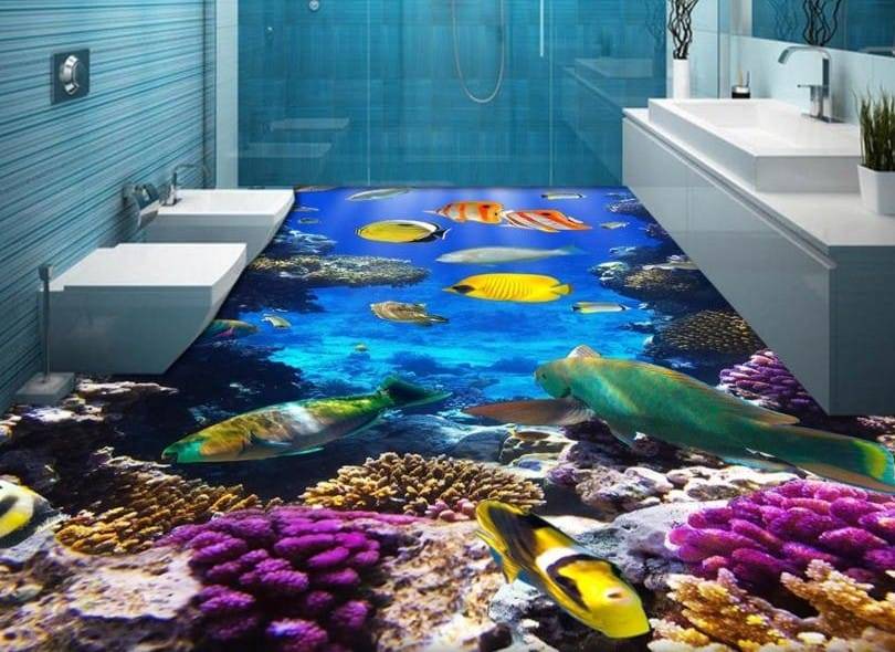 Однако, технология дает намного больше вариантов оформления: отказавшись от цветов и дельфинов, можно обнаружить, что есть красивые геометрические или абстрактные узоры. Либо вообще отказаться от рисунков, сделав покрытие однотонным и цветным.