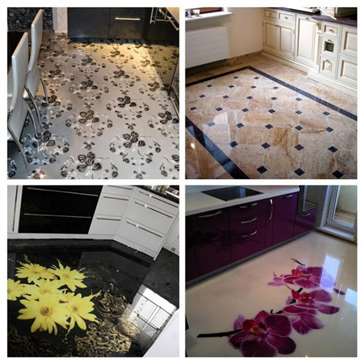 Такое покрытие встречается на кухнях пока еще очень редко. Хотя характеристики наливного пола вполне подходят для кухонного помещения со всеми его особенностями. Основными достоинствами покрытия является прочность и износостойкость. Правильно обустроенный наливной пол не требует ремонта и переделки долгие годы. Также отличным его качеством является простота эксплуатации. Мыть такой пол не составит труда, что позволит поддерживать необходимую чистоту в помещении, где готовится пища. О декоративности покрытия следует сказать особо. Пол можно изготовить любого цвета, оттенка и даже с объемным изображением. Конечно, наливные 3d полы будут уместны далеко не для каждого интерьера.